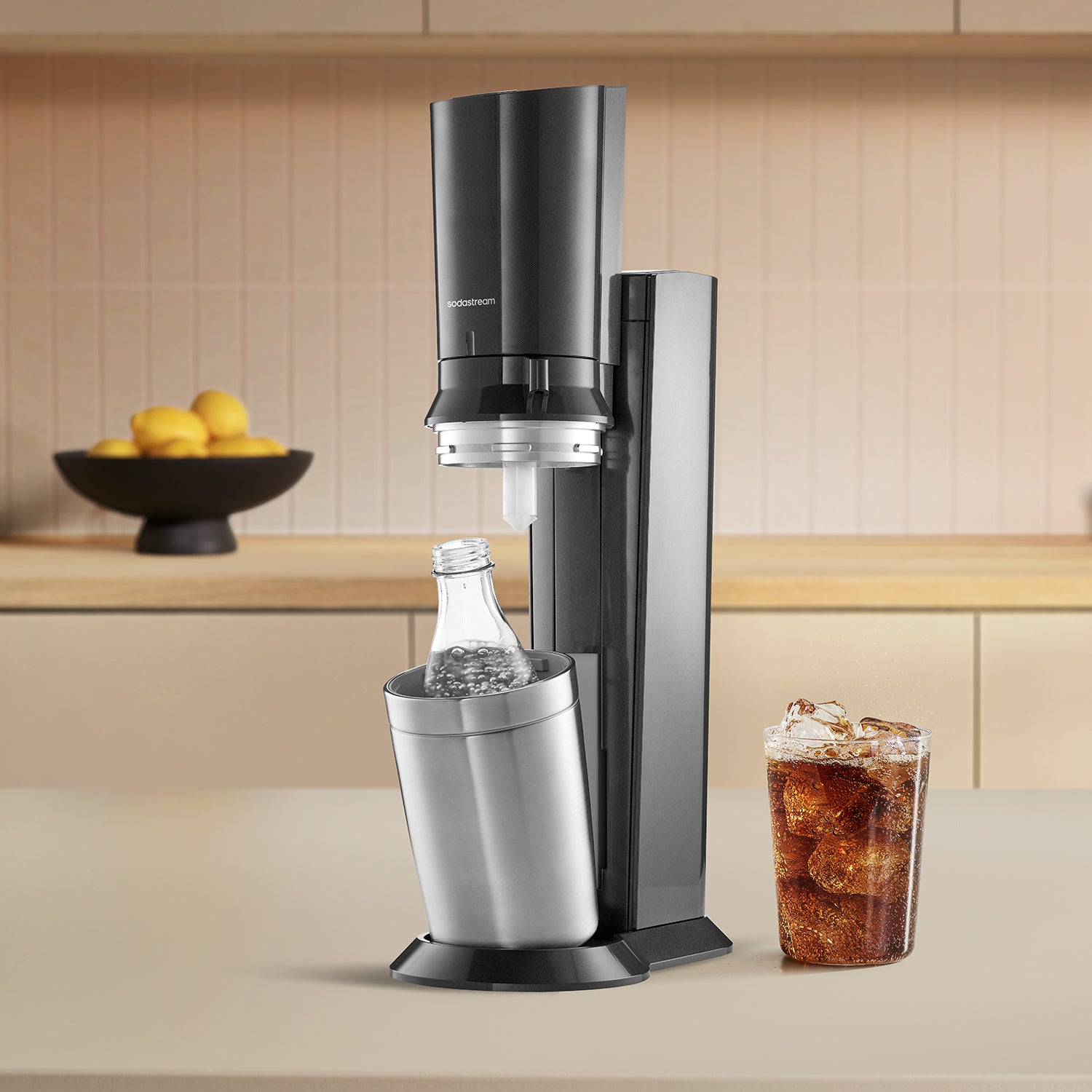 Remplis la carafe en verre élégante avec de l’eau bien fraîche, puis place-la en toute sécurité dans le compartiment en acier inoxydable du Sodastream CRYSTAL®.