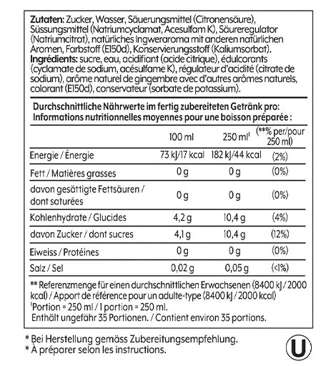 Alternative Zubereitungsmöglichkeiten: 0,7 L Glaskaraffe: Dosierkappe bis zur untersten Linie innerhalb des Messbechers füllen. 250 ml Glas: 2 ½ Teelöffel (12 ml) in ein 250 ml Glas geben und mit gesprudeltem Wasser auffüllen. ERST SPRUDELN DANN SIRUP HINZUFÜGEN.